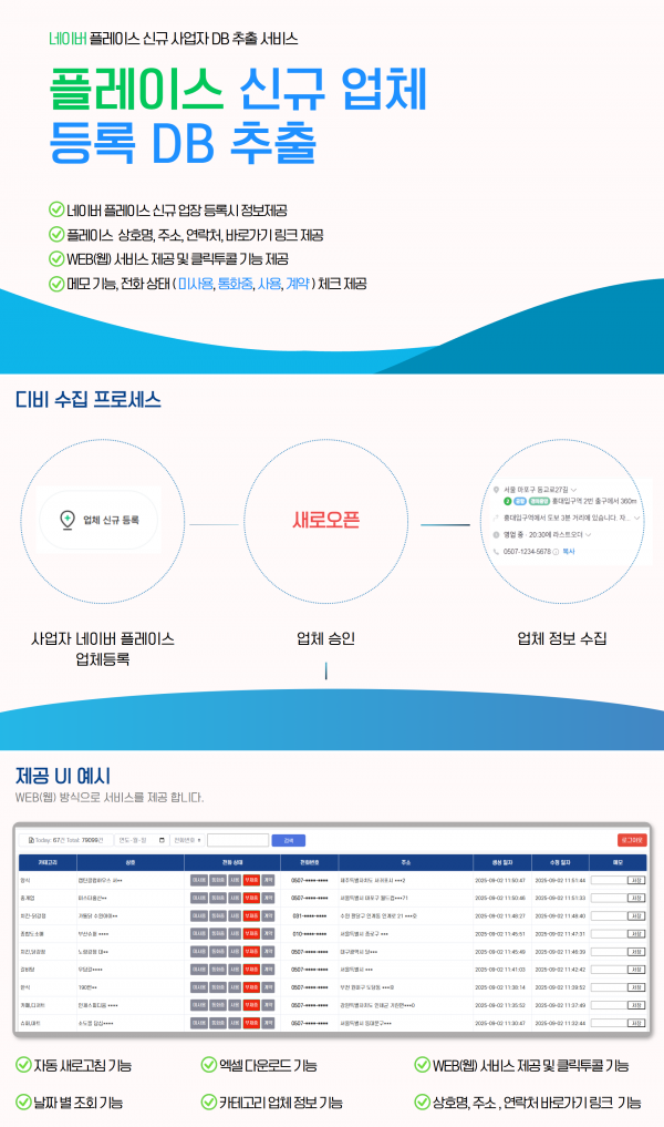 네이버 플레이스에 신규 업체가 등록되면 1초 단위로 실시간 수집이 가능하며, 수집량 또한 많습니다.